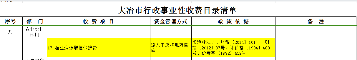 2026年大冶市农业农村局行政事业性收费目录清单