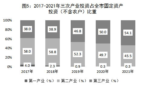 在全市固定资产投资(不含农户)中,第一产业投资额比上年增长35.9%,占全市固定资产投资(不含农户)比重为0.3%;第二产业增长10.8%,占比45.5%;第三产业增长31.0%,占比54.1%。