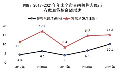 年末全市金融机构人民币各项贷款余额532.89亿元,比上年年末增长15.2%。其中,住户贷款175.51亿元,增长16.5%;非金融企业及机关团体贷款357.38亿元,增长14.6%。