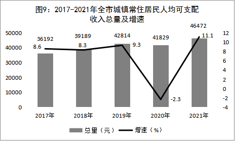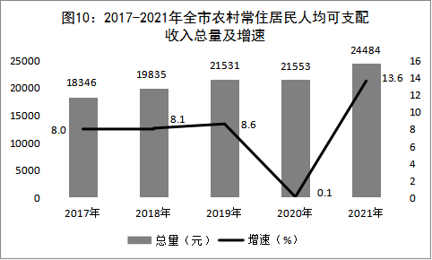 城乡居民收入稳定增长。全年全市城镇常住居民人均可支配收入46472元,增长11.1%;农村常住居民人均可支配收入24484元,增长13.6%。