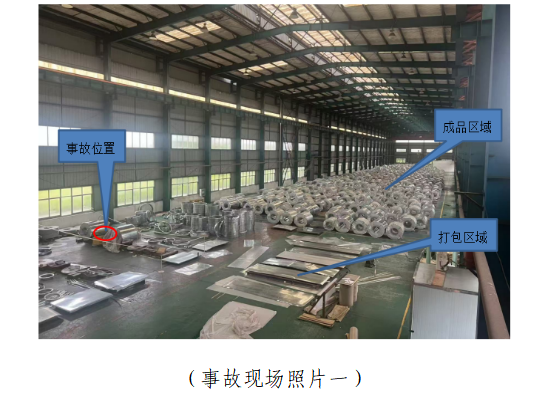 1.事故发生区域。事故发生在兴冶薄板公司镀锌车间硅钢库包装区。该车间为一栋单层钢结构厂房,彩钢板坡屋顶屋面,呈东西方向建设,长200m、宽18m、高16m,厂房内布置两台行车,分硅钢包装区和成品存放库,事故发生地点位于包装区,硅钢包装区位于车间东端,占车间约四分之一的长度面积,主要有镀锌薄板、包装带等打包材料和钢卷打包时搁置使用的鞍座等设备设施(见事故现场照片一)。
