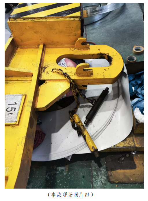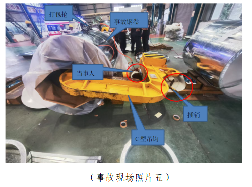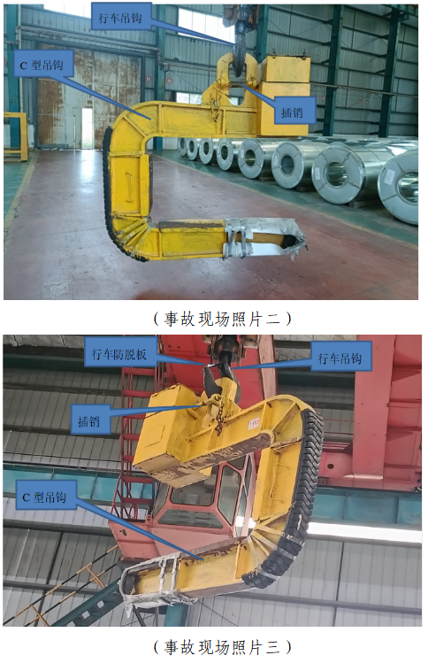 5.C型钩吊具情况。该吊具由C形钢材本体、吊耳和安全插销组成,C形钩长1.42m、C形扣间距1.04m,吊耳长0.36m,钢材制作,重约1吨(见事故现场照片二)。C型钩位于行车吊钩内,防脱板位于吊钩内侧;但因C型钩较重且较大,无法起到防脱决定性作用,实际防脱功能依靠位于C型钩上的两个插销锁实现,在两个插销均处于锁定工作状态时,C型钩无法从行车吊钩中脱落(见事故现场照片三)。但是事故C型钩上的两个插销其插孔设计均为向上开口,事故发生时从其插孔中脱落,当事人被压在C型钩下面(见事故现场照片四、五)。