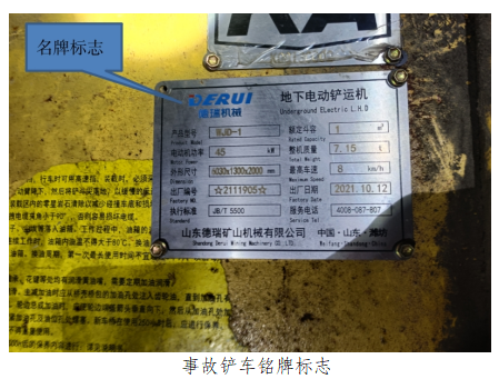 2.事故铲车情况。所维修的铲车为地下电动铲运机,山东德瑞矿山机械有限公司生产,型号WJD-1,电动机功率45kW,额定斗容1m3,最高车速8km/h,外形尺寸:长×宽×高=6030×1300×2000mm,整车质量7.15t,出厂日期2021年10月12日,出厂编号2111905,矿用产品安全标志编号KCG130002。