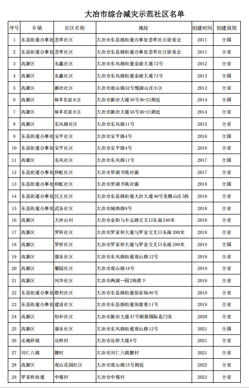 2025年度大冶市综合减灾示范社区名单