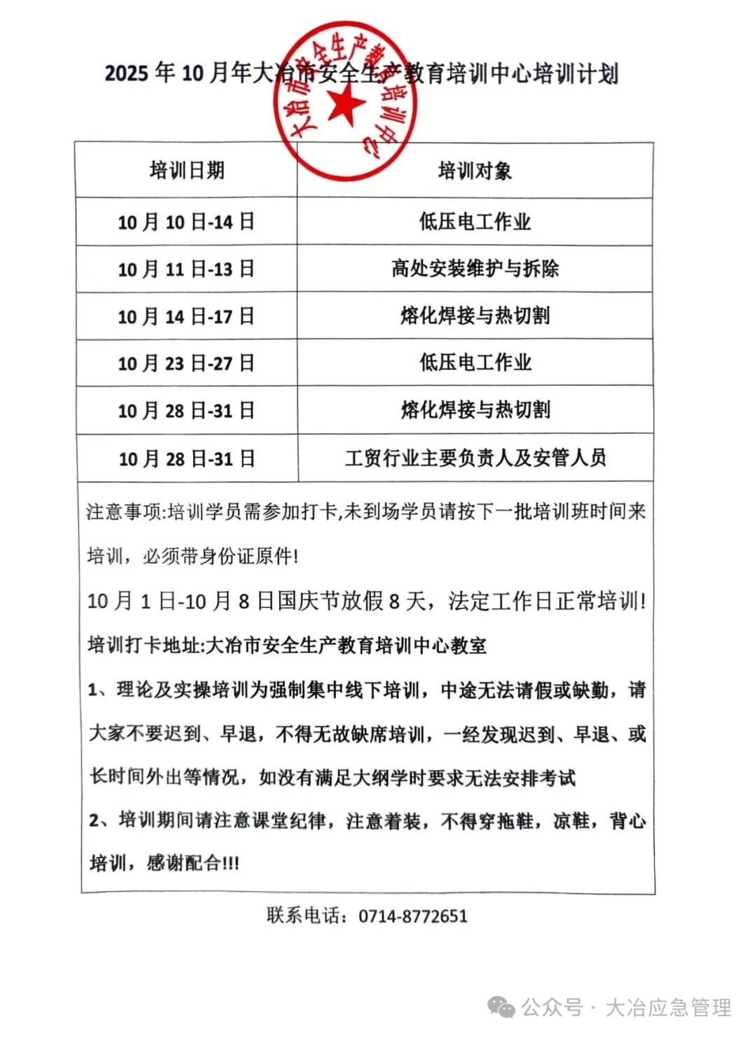 为扎实做好安全生产教育培训工作,帮助企业主要负责人、安全管理人员、特种作业人员持证上岗,现将大冶市安全生产教育培训中心10月份安全培训计划予以公布,有需要的企业和从业人员,请合理安排时间,尽快与安全培训中心联系(8771689,8772651)参加培训。