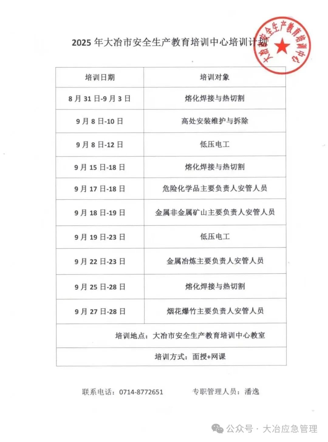 为扎实做好安全生产教育培训工作,帮助企业主要负责人、安全管理人员、特种作业人员持证上岗,特将大冶市安全生产教育培训中心9月份安全培训计划予以公布,有需要的企业和从业人员,尽快与安全培训中心联系(8771689,8772651)。
