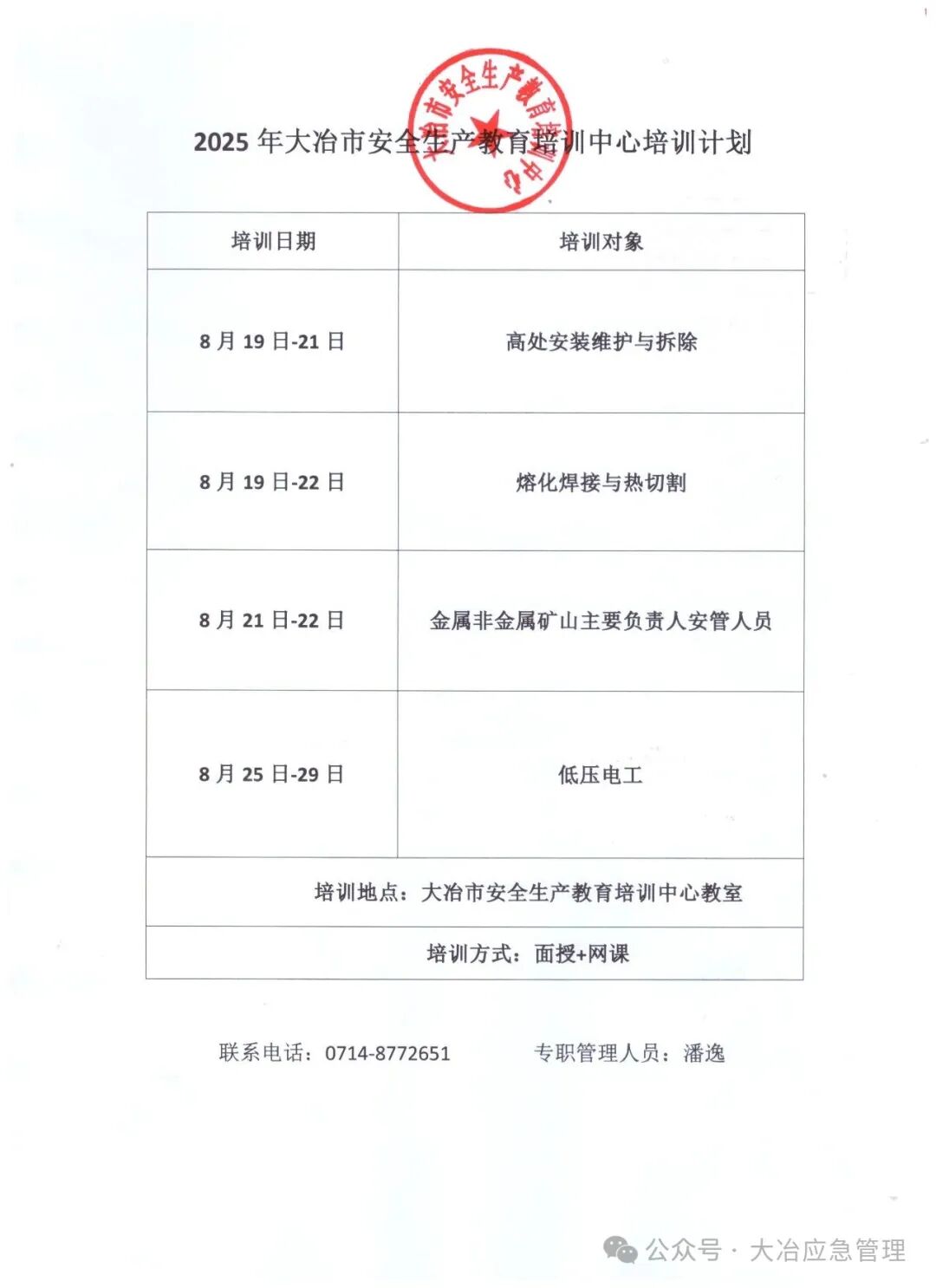 为扎实做好安全生产教育培训工作,帮助企业主要负责人、安全管理人员、特种作业人员持证上岗,特将大冶市安全生产教育培训中心8月下旬安全培训计划予以公布,有需要的企业和从业人员,尽快与安全培训中心联系(8771689,8772651)。