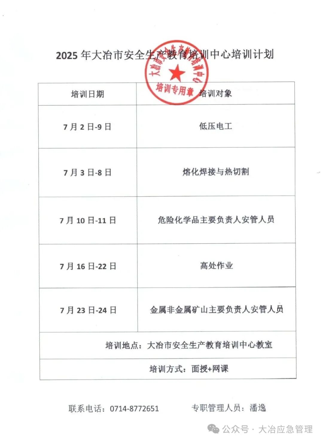为扎实做好安全生产教育培训工作,帮助企业主要负责人、安全管理人员、特种作业人员持证上岗,特将大冶市安全生产教育培训中心7月份安全培训计划予以公布,有需要的企业和从业人员,尽快与安全培训中心联系(8771689,8772651)。