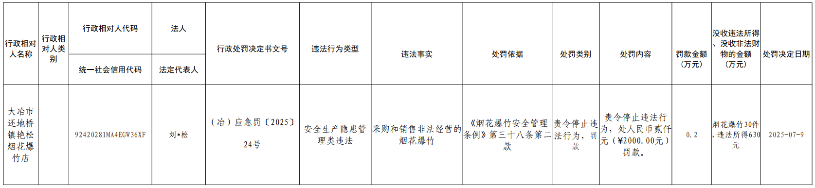 大冶市应急管理局2025年行政处罚信息公示