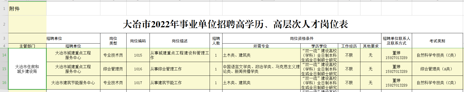 具体招聘岗位、招聘人数、岗位资格条件等详见附件《大冶市2022年事业单位招聘高学历、高层次人才岗位表》(以下简称《岗位表》)。