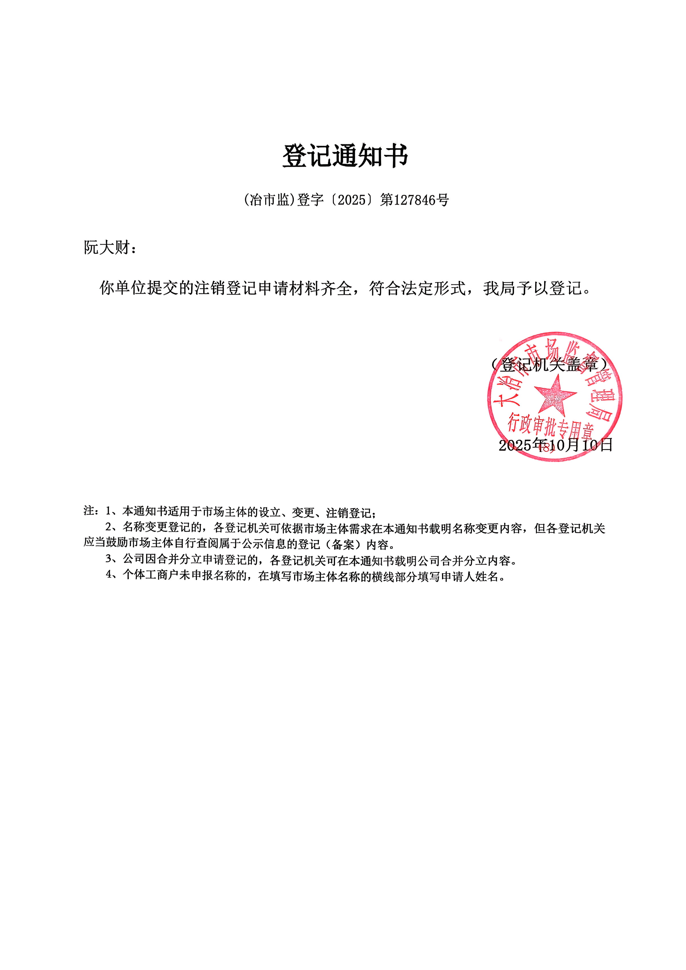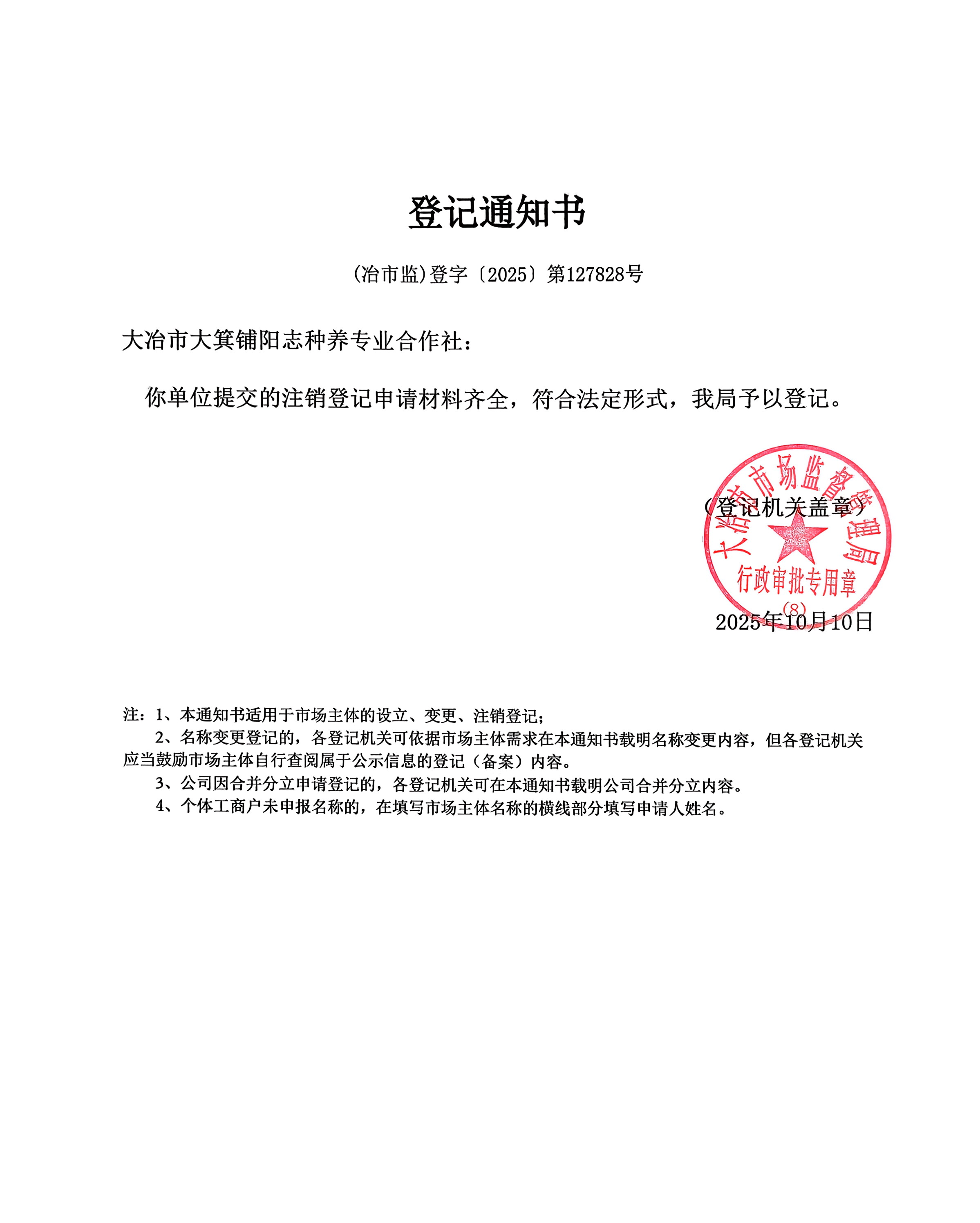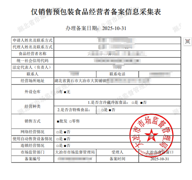 2025年10月登记通知书、预包装采集表