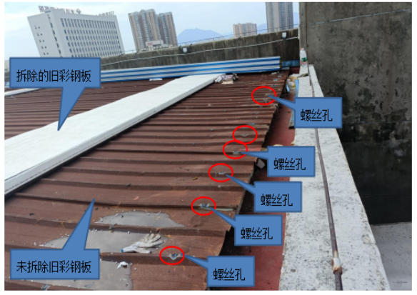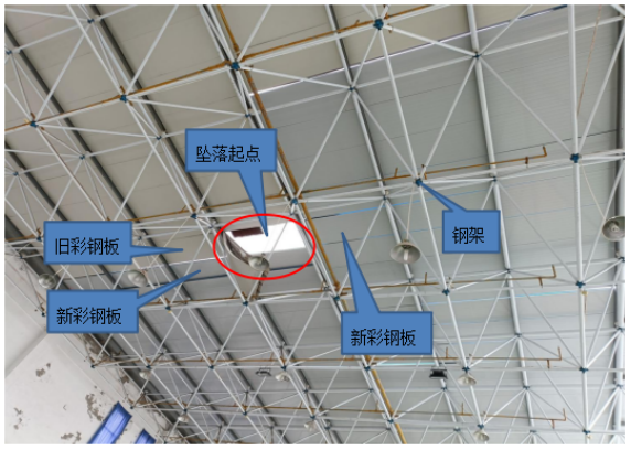 2.彩钢板屋面更换情况。旧彩钢板为双层压型钢板,上层厚0.6mm,下层厚0.5mm,中间夹设聚苯乙烯泡沫隔热层,单块彩钢板重约50kg;新彩钢板亦为双层压型钢板,上层厚0.6mm,下层厚0.5mm,中间夹设玻璃棉卷毡隔热层,单块彩钢板重约100kg。事发时屋顶中部和西北面旧彩钢板已部分更换;东面位置旧彩钢板被拆除,剩下钢结构和檩条框架;西南角屋面旧彩钢板固定螺丝已拆除,屋面叠放一些准备更换的新彩钢板和少量被拆除的旧彩钢板。