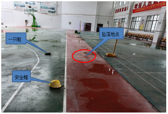 3.现场安全防护措施情况。西南角屋面的旧彩钢板上呈南北方向搁置两块被拆除的旧彩钢板,其中一块旧彩钢板端头、与新更换彩钢板相邻的一块未拆除的旧彩钢板上端塌陷,塌陷空挡长2.5m、宽1m;其下方为钢结构框架及其底部的五楼塑胶地面,地面遗留有当事人使用的一顶安全帽和一只鞋。施工作业面上方未预设用于钩挂安全带的钢丝绳,其下方未设置防止人员坠落的安全(兜)网。事发时施工人员在屋面作业中均未使用安全带,仅在屋面入口处堆放有4根安全带。
