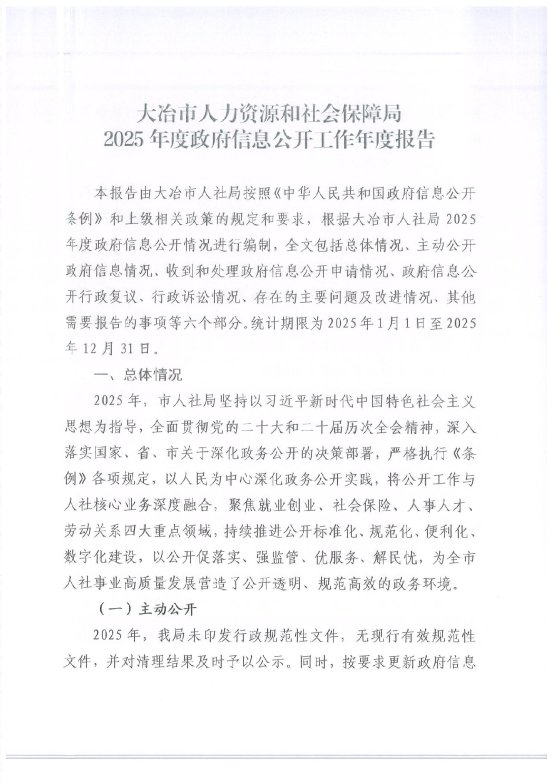 大冶市人力资源和社会保障局2025年度政府信息公开工作年度报告